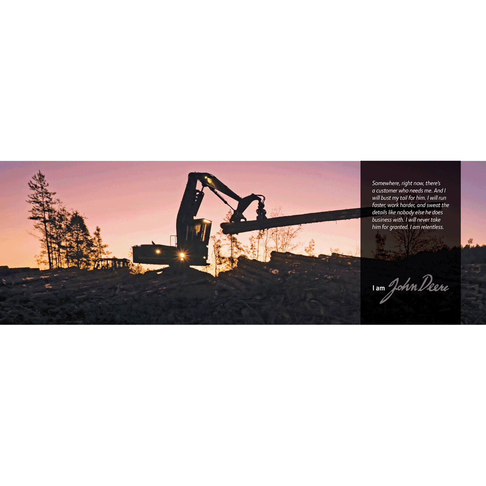 "I am John Deere" graphic featuring forestry equipment. Set up as 72"w x 24"h digital print. Choose your finishing. Your John Deere brand message is loud and clear.