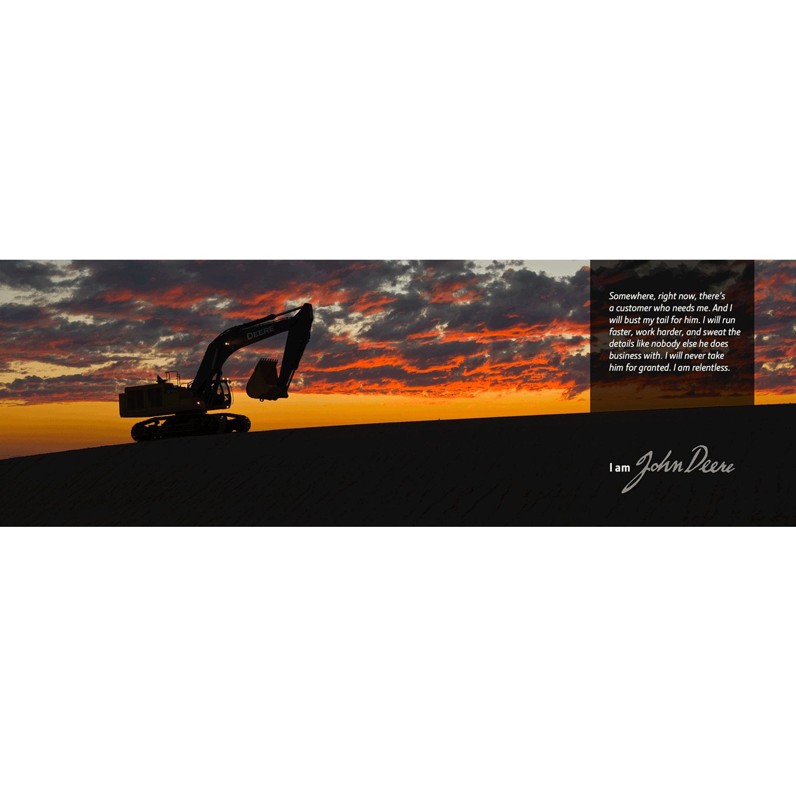 "I am John Deere" graphic featuring construction equipment. Set up as 72"w x 24"h digital print. Choose your finishing. Your John Deere brand message is loud and clear.