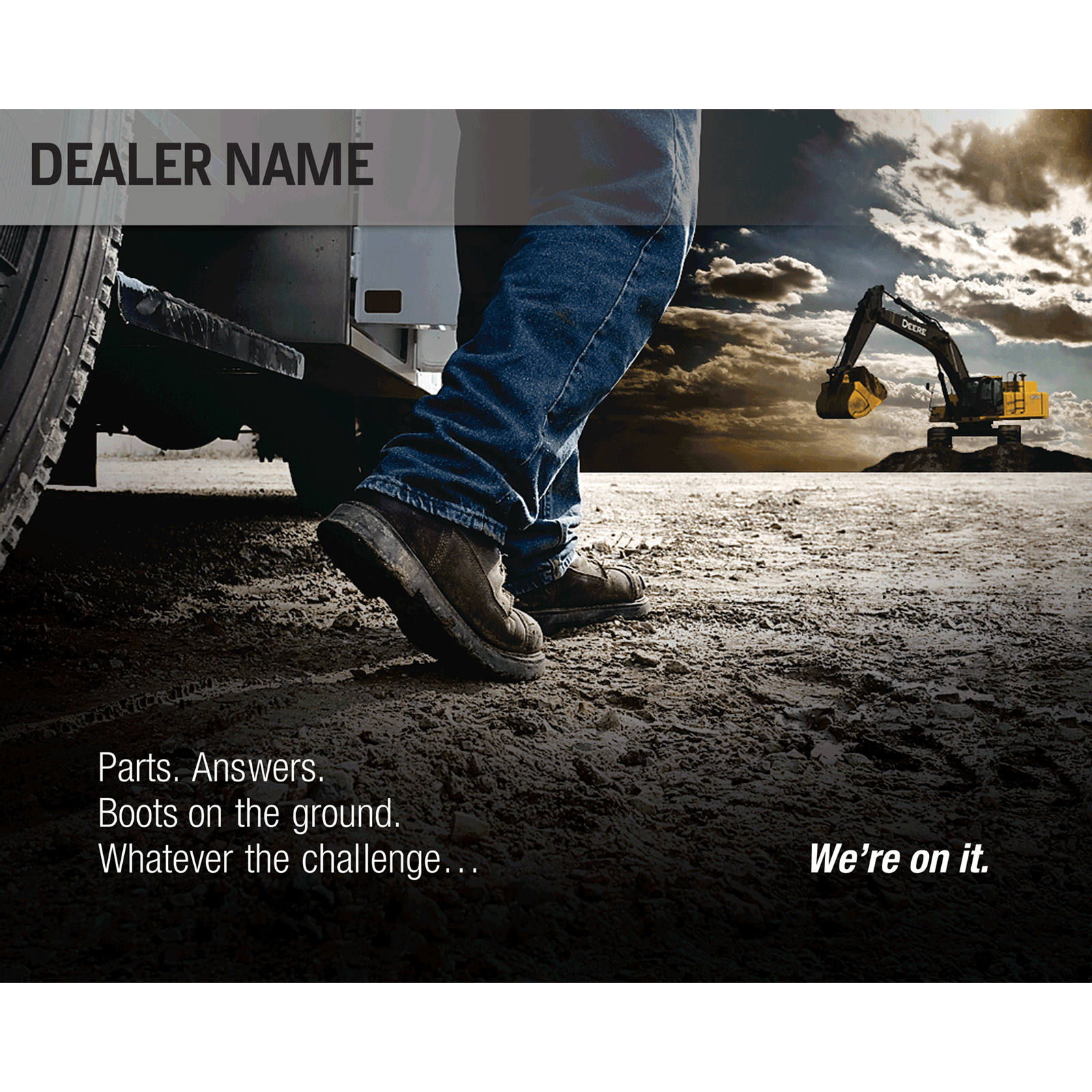 "We're On It - Parts. Answers. Boots on the ground. Whatever the challenge...We're on it." Support your parts department with this impactful graphic. Available in several options and 2 sizes for indoor applications. Vinyl banner has taped edges and grommets. Framed prints have our standard black aluminum frames.
